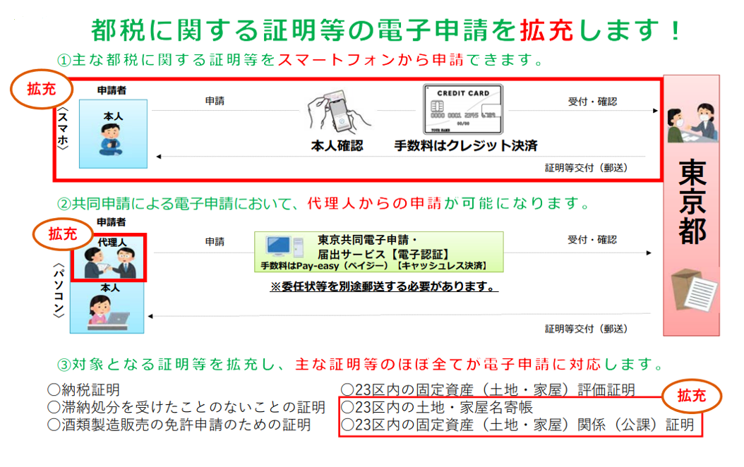 - そのほか、「東京共同電子申請・届出サービス」(以下「共同申請」)による電子申請も、より多くの方にご利用いただけるよう、申請対象者等を拡充しました。これらの拡充により、主な証明申請等のほぼ全てが電子申請できるようになりました。